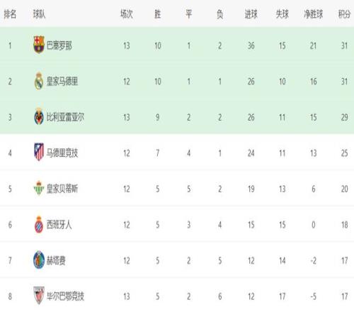 在积分榜上,巴萨暂时超越皇马登顶。巴萨10胜1平2负,拿到31分。皇马也是31分,但是净胜球比巴萨少,只能排名第2。不过,皇马比巴萨少踢1场,接下来有机会重新登顶。比利亚雷亚尔以29分排名第3,与巴萨皇马的差距很小。马竞以25分排名第4。第5的是皇家贝蒂斯,拿到了20分。西班牙人以18分排名第6。赫塔费和毕尔巴鄂竞技都是17分。塞维利亚和皇家社会只拿到16分。